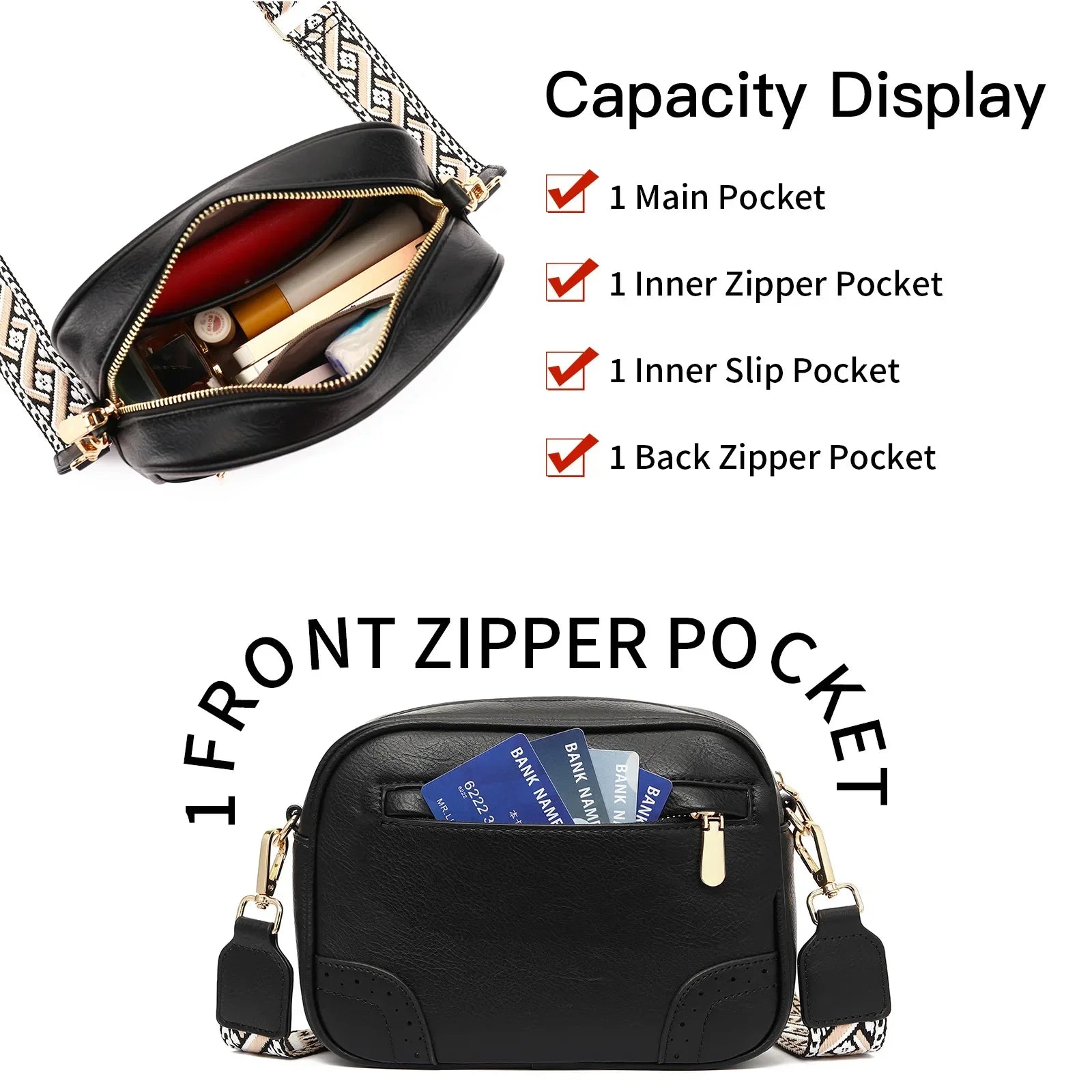 • Compartments: Main compartment with inner zip pocket and card slots